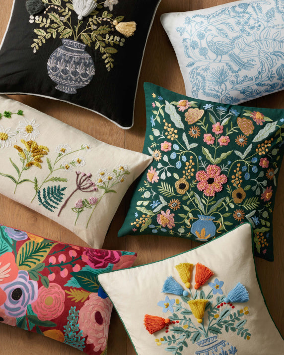 Created in partnership with Loloi, our collection of rugs pairs traditional and vintage designs with our signature florals, complete with soft textures and elegant color palettes. The pillow collection is designed to mix and match, with charming details and embroidery.